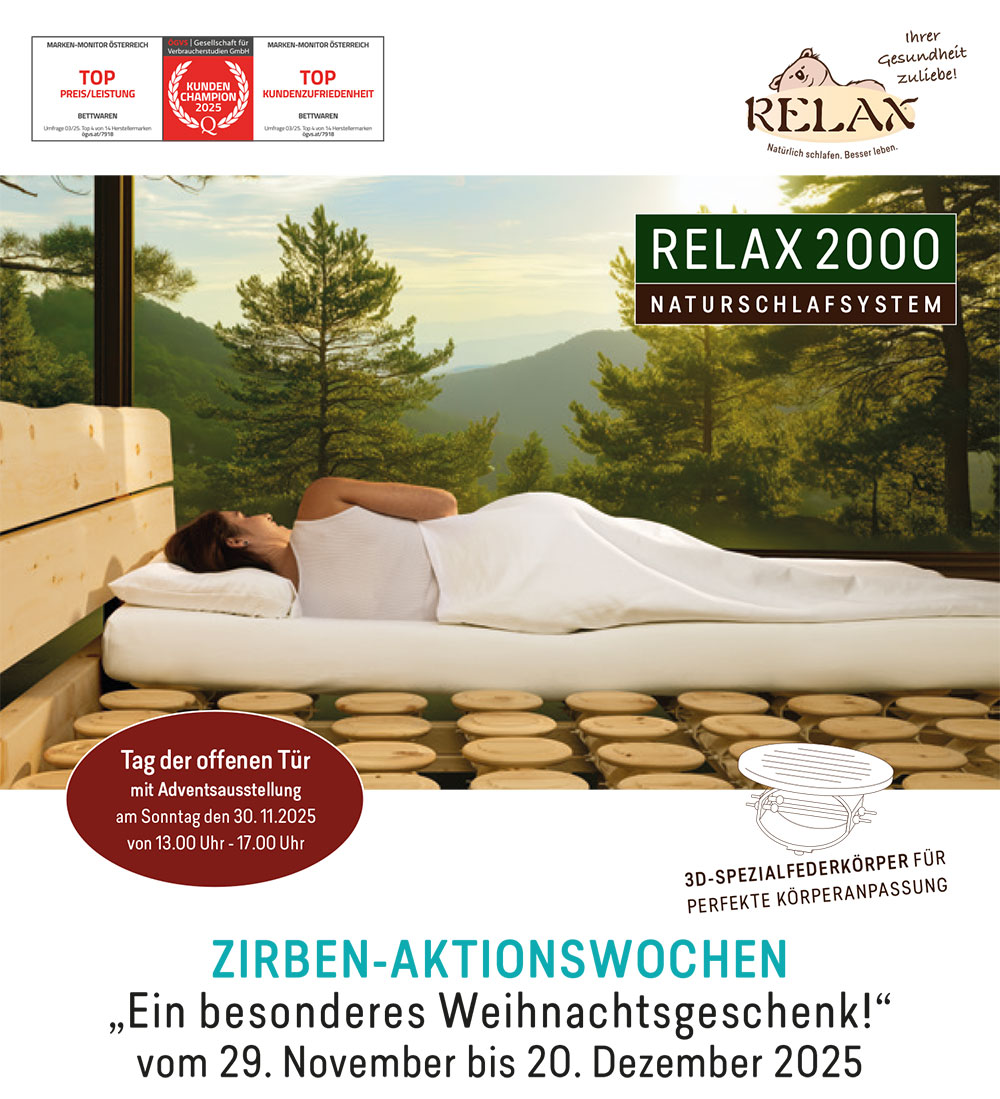 Ein erholsamer Schlaf ist die Basis für unsere Gesundheit. Vor allem Menschen mit Rückenschmerzen wissen, wie wichtig eine optimale Schlafunterlage ist, die sowohl Komfort als auch Stützkraft bietet. Das Relax 2000 Schlafsystem ist speziell dafür entwickelt, den Rücken optimal zu unterstützen und Verspannungen zu lösen. Durch die Flexibilität des Holztellerrostes aus Zirbenholz passt sich das System Ihren individuellen Körperkonturen an, entlastet die Wirbelsäule und verhindert schmerzhafte Druckstellen. Neben einem passenden Schlafsystem können Sie auch durch eine ergonomische Matratze und das richtige Kissen Ihren Schlafkomfort weiter steigern. Gerade für Seitenschläfer bietet das Relax 2000 System mit der Komfort-Schulterzone einen besonders hohen Komfort und fördert die entspannte Haltung der Wirbelsäule – für mehr Erholung und weniger Schmerzen.